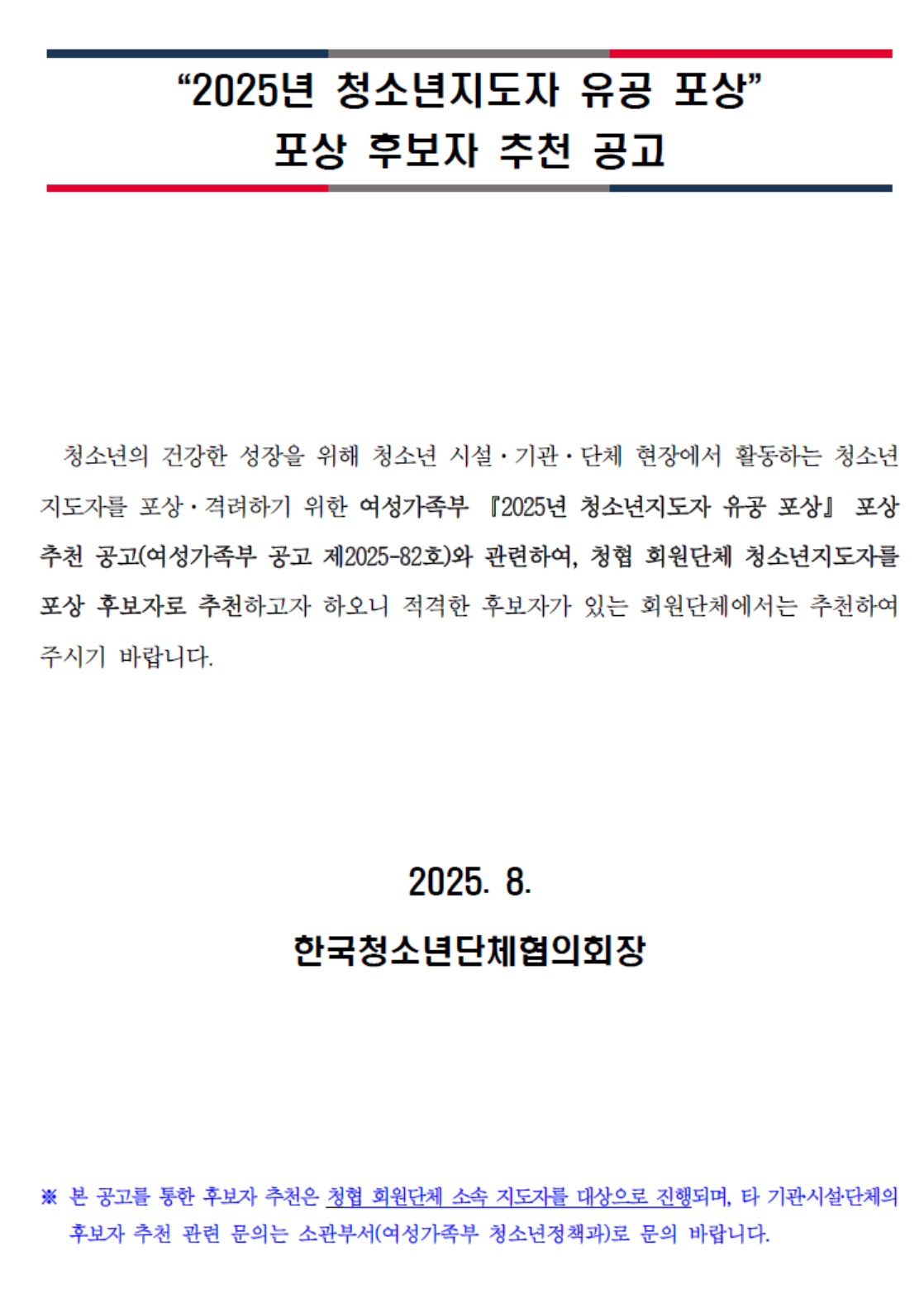♠「2025년 청소년지도자 유공 포상」후보자 추천 공고 ♠