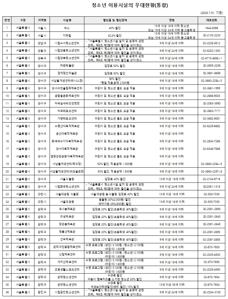 청소년 이용시설 우대현황