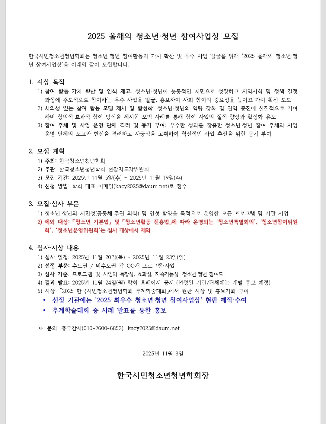 [한국시민청소년청년학회] 「올해의 청소년·청년 참여사업상(올참상)」 공모 및 시상 계획 안내 페이지 정보 작성자 관리자 작성일2025.11.04 조회20회 댓글0건 본문 * 보다 자세한 내용은 해당 사업의 주최기관 홈페이지에서 확인하시기 바랍니다. (링크: http://www.civicyouth.kr/?c=5/79&uid=28) 댓글목록 등록된 댓글이 없습니다. 이전글 다음글 목록