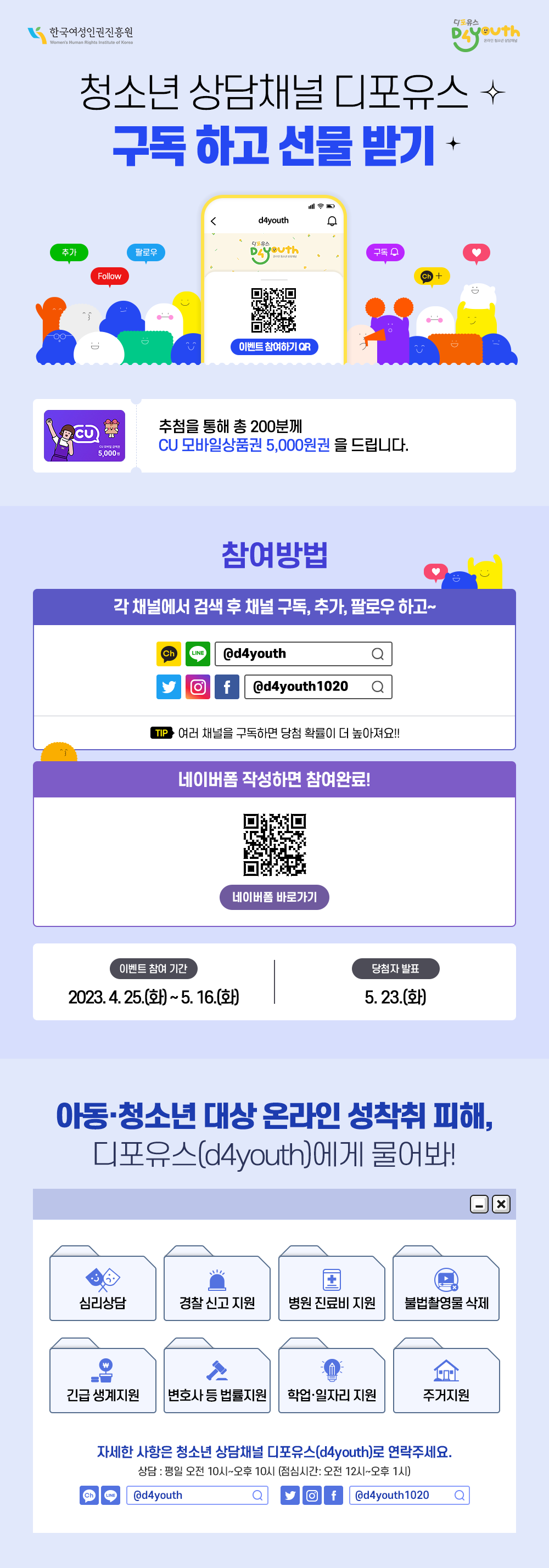 [한국여성인권진흥원] 청소년 상담채널 디포유스 구독 이벤트 페이지 정보 작성자 관리자 작성일2023.04.28 조회5,951회 댓글0건 본문 댓글목록 등록된 댓글이 없습니다. 이전글 다음글 목록