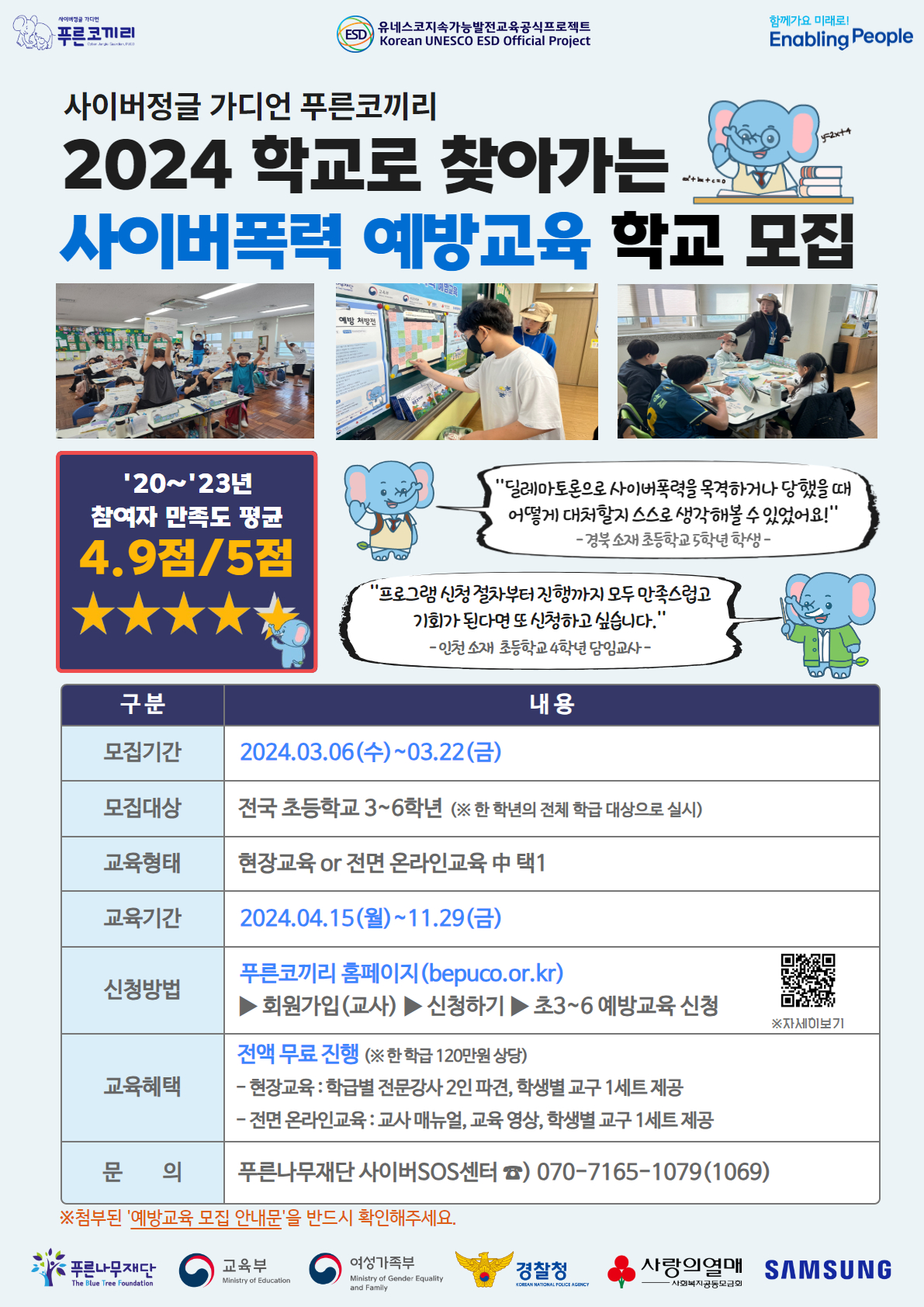 [푸른나무재단] 2024 사이버 학교폭력 예방교육(푸른코끼리) 모집 안내 페이지 정보 작성자 관리자 작성일2024.03.08 조회2,167회 댓글0건 첨부파일 붙임2. [푸른나무재단]_2024 사이버 학교폭력 예방교육푸른코끼리 모집 안내 자료.pdf (2.3M) 75회 다운로드 본문 * 보다 자세한 내용은 붙임 '모집 안내문'을 통해 확인 바랍니다. 댓글목록 등록된 댓글이 없습니다. 이전글 다음글 목록