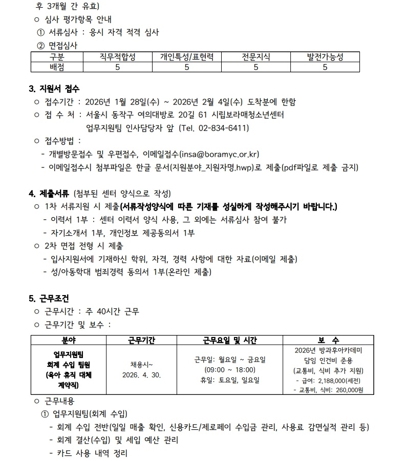 시립보라매청소년센터 업무지원팀 회계 수입 육아 휴직 대체(계약직) 채용 공고 페이지 정보 작성자 보라매 작성일2026.01.28 조회4회 댓글0건 첨부파일 2. 보라매 별첨1. 입사지원서업무지원팀_회계 수입.hwp (52.0K) 0회 다운로드 본문 댓글목록 등록된 댓글이 없습니다. 이전글 다음글 목록