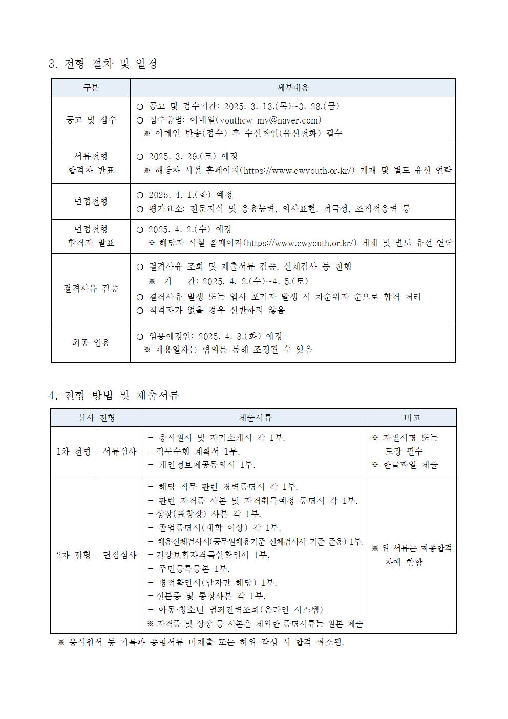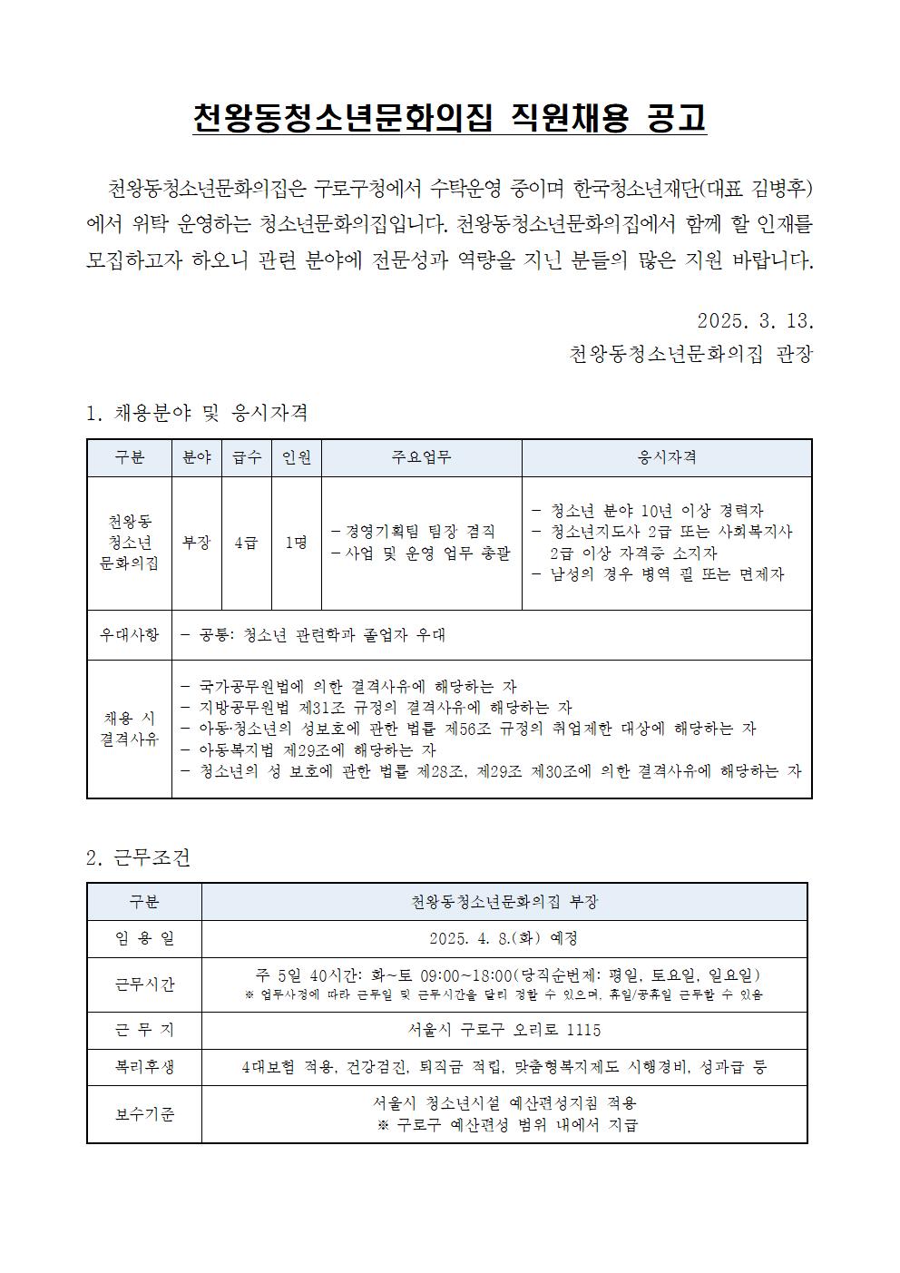 2025년 천왕동청소년문화의집 직원(부장) 채용 공고