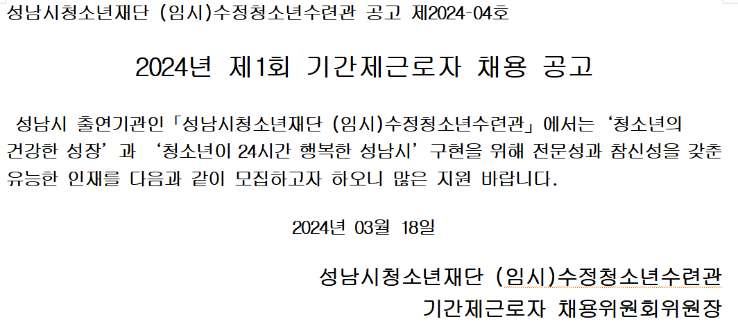 [성남시청소년재단 (임시)수정청소년수련관] 2024년 제1회 기간제근로자 채용 공고 페이지 정보 작성자 관리자 작성일2024.03.18 조회4,032회 댓글0건 첨부파일 2024년 제1회 기간제근로자 채용 공고 및 응시원서.hwp (80.0K) 179회 다운로드 본문 * 보다 자세한 내용은 붙임 '공고문'을 통해 확인 바랍니다. 댓글목록 등록된 댓글이 없습니다. 이전글 다음글 목록