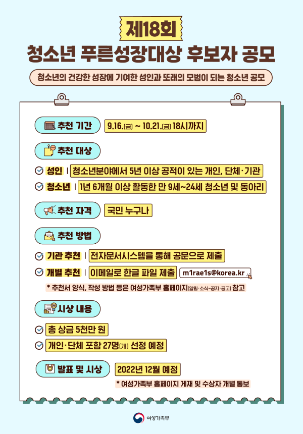 [여성가족부] 제18회 청소년푸른성장대상 후보자 추천 및 홍보 페이지 정보 작성자 관리자 작성일2022.09.22 조회7,591회 댓글0건 첨부파일 붙임_1._제18회_청소년푸른성장대상_후보자_모집_공고문.hwp (36.5K) 98회 다운로드 붙임_2.__별첨_제18회_청소년푸른성장대상_추천서류_양식.hwp (85.0K) 94회 다운로드 붙임_3._제18회_청소년푸른성장대상_홈페이지_등_게시문_예시_.hwp (81.0K) 79회 다운로드 본문 * 보다 자세한 내용은 붙임 문서를 통해 확인하시기 바랍니다. 댓글목록 등록된 댓글이 없습니다. 이전글 다음글 목록