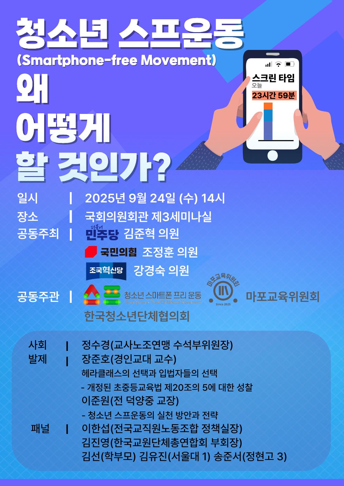 ♠ [청소년 스마트폰 프리운동본부] '청소년 스프운동 왜 어떻게 할 것인가?' 세미나 개최 안내 ♠ 페이지 정보 작성자 관리자 작성일2025.09.15 조회2,200회 댓글0건 본문 ※ 참석을 희망하시는 분께서는 한국청소년단체협의회(☎ 02-2667-0875)로 문의하여 주시기 바랍니다. 댓글목록 등록된 댓글이 없습니다. 이전글 다음글 목록