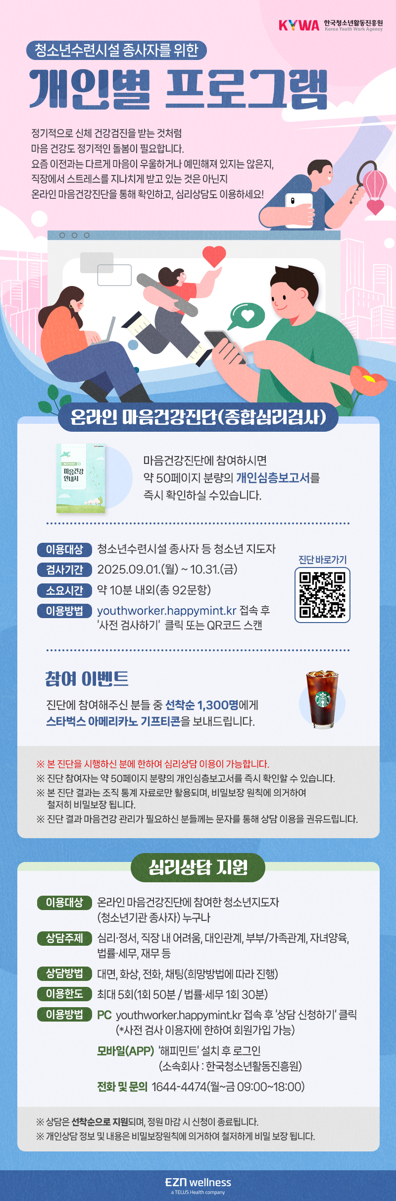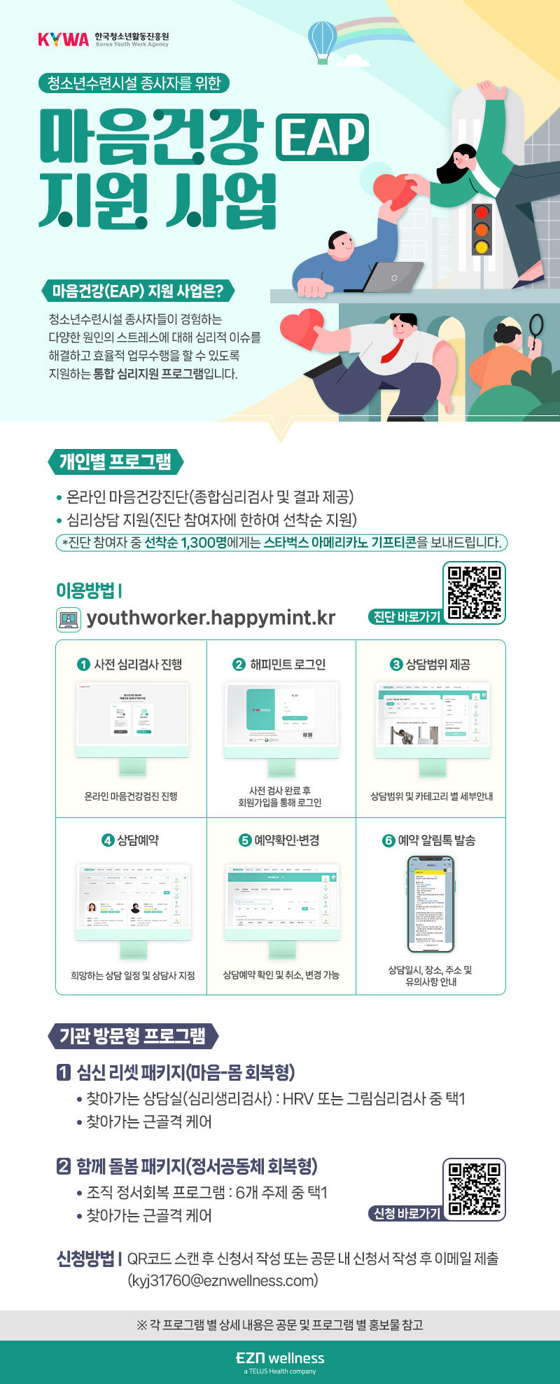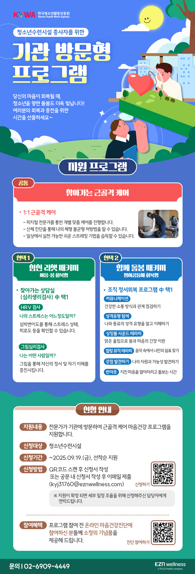 [한국청소년활동진흥원] 2025년 청소년수련시설 종사자 마음건강(EAP) 지원 및 참여기관(자) 모집 안내 페이지 정보 작성자 관리자 작성일2025.09.03 조회1,600회 댓글0건 본문 * 관련링크: https://www.kywa.or.kr/pressinfo/notice_view.jsp?no=35426 댓글목록 등록된 댓글이 없습니다. 이전글 다음글 목록