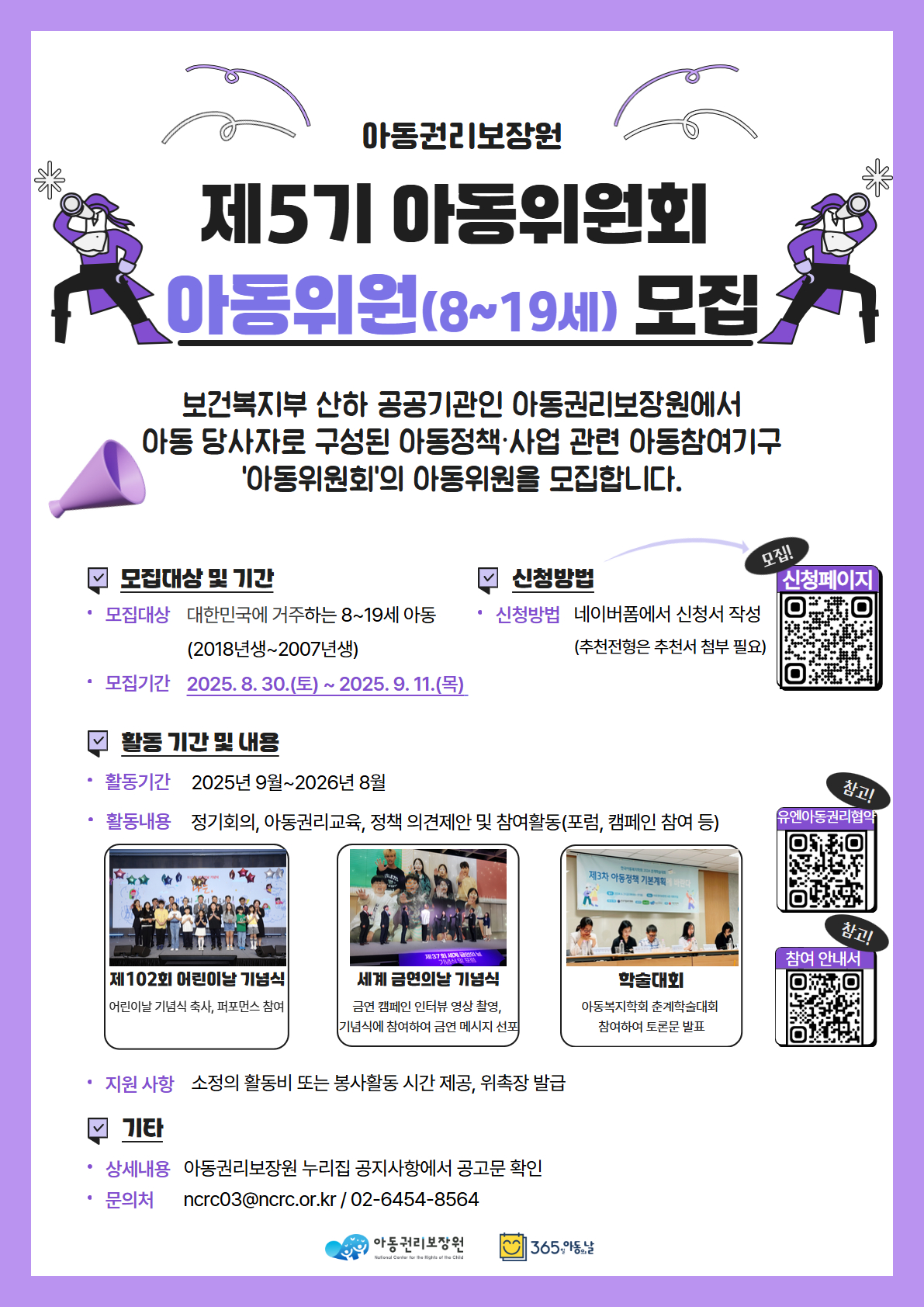 [아동권리보장원] 2025년 제5기 아동위원회 아동위원 모집 안내 페이지 정보 작성자 관리자 작성일2025.09.03 조회1,568회 댓글0건 첨부파일 붙임 1. 2025년 제5기 아동위원회 아동위원 모집 안내문.pdf (428.2K) 40회 다운로드 붙임 3. 참고용 아동위원회 참여안내서.pdf (2.0M) 43회 다운로드 본문 * 보다 자세한 내용은 붙임 '안내문' 등을 통해 확인하시기 바랍니다. 댓글목록 등록된 댓글이 없습니다. 이전글 다음글 목록