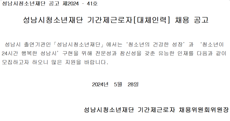 [성남시청소년재단] 2024 성남시청소년재단 기간제근로자 공개채용 공고 페이지 정보 작성자 관리자 작성일2024.05.28 조회4,123회 댓글0건 첨부파일 2024년 제3회 성남시청소년재단 기간제근로자대체인력 채용 공고문 및 응시서류.hwp (71.0K) 180회 다운로드 본문 * 보다 자세한 내용은 붙임 '공고문' 등을 통해 확인 바랍니다. 댓글목록 등록된 댓글이 없습니다. 이전글 다음글 목록