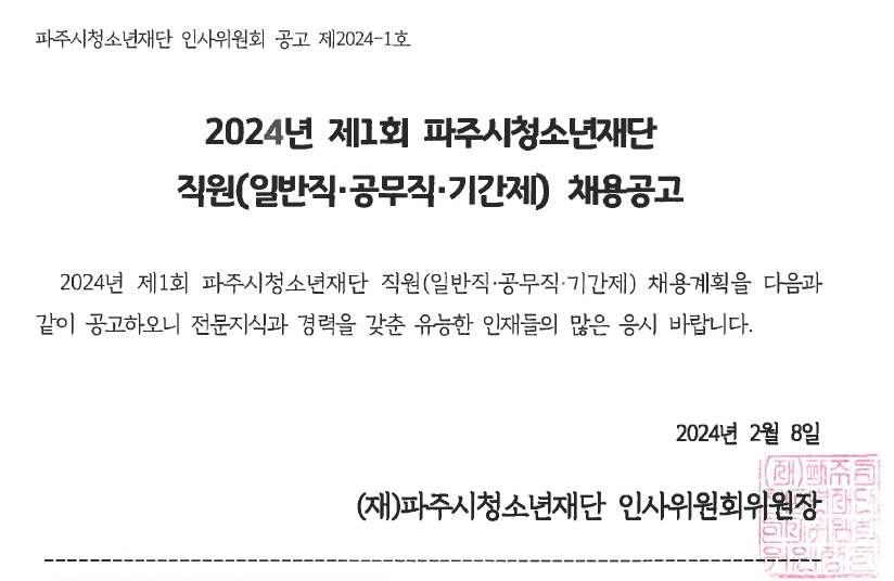 [파주시청소년재단] 2024년 제1회 파주시청소년재단 직원(일반직·공무직·기간제) 채용공고